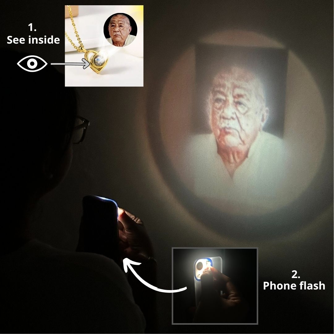 Tu foto vive dentro de este dije. Puedes verla acercando el ojo o proyectarla hacia la pared con la luz del flash de tu celular, para hacer brillar la fotografía en la pared.